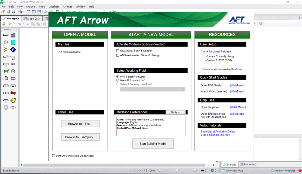 AFT Arrow採用圖形化的工作交互工作環境,使用者採用拖放的方式建模,單元包括:儲罐、分支、壓縮機/風機、換熱器、給定流量元件、給定壓力元件、變徑、彎頭、三通、閥門、止回閥、調節閥、盲端、孔板、文丘裡管、濾網、噴頭、通用阻力元件。